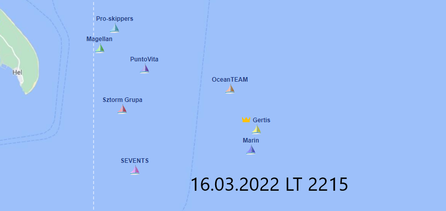Marin i Gertis w zaciętym wyścigu. W ciągu dnia Gertis wysunął się na prowadzenie. Gratulujemy. To dla sprawy! Mobilizacja Drużyny Marina dała efekty i wysunęła się znów na prowadzenie ok 2200. Czy to nieuwaga sternika, czy zbytnie poluzowanie szotów i Gertis znów o 2215 wychodzi na prowadzenie. Waw! Jest moc!