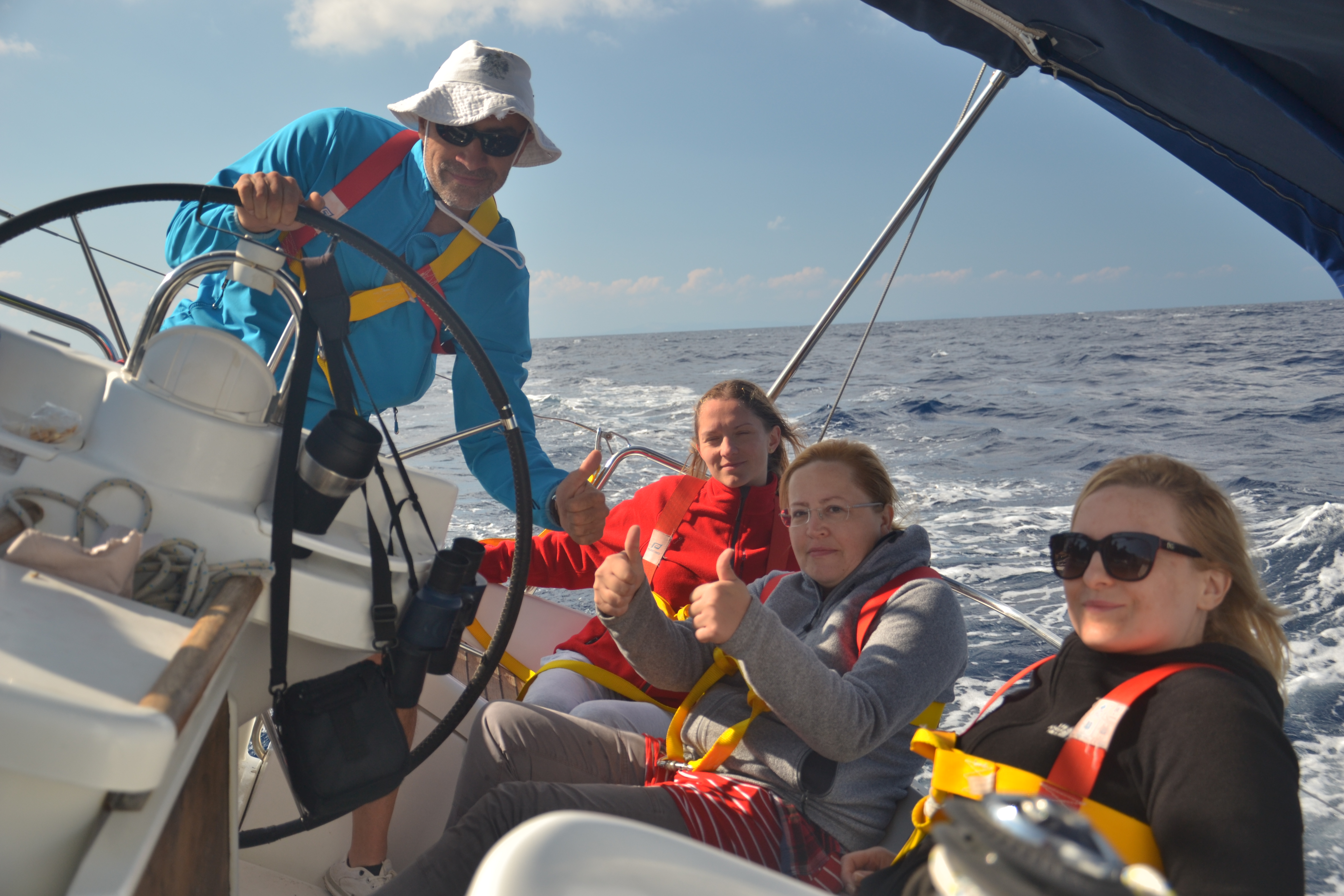 Z Olbii popłynęliśmy na południe zachodnim wybrzeżem Sardynii. Pierwszym przystankiem była La Caletta potem Santa Maria Navaresse. Spędziliśmy wieczór w Cagliari zwiedzając miasto. Ciekawa tez była kolejna przystań, Marina Teulada, otoczona poligonem marynarki wojennej. Omijając poligon ruszyliśmy w dalszą podróź. Wiało mało więc przez pewien czas płyneliśmy po “mazursku” związani burta w burtę, co poprawiało komunikację między załogami. I wtedy dopadło nas przemiłe stado delfinów. Gdy nas opuściły, na środku morza pływała nasza załoga pod przewodem Pingwina. Wieczorem doszlismy do Carloforte.